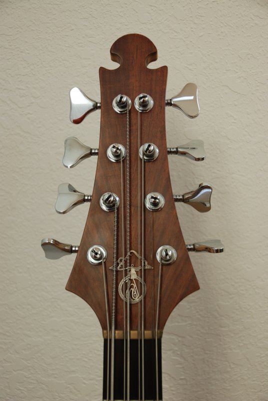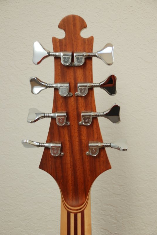 I realized I have a picture of the back of my 8-string headstock. It has a detail that screams Alembic!.  The top two tuning heads are carefully placed just the right distance apart so they share a single mounting screw!