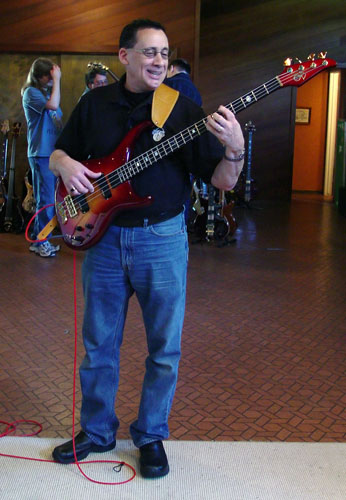 Bradley trying out the fretless I brought fromt eh Showroom: