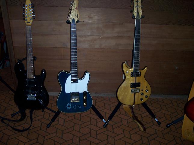 Sharp eye!  You can see it best in the above pic where it is to the right of my black Fender Strat 12 (w/ Alembic PUs), my blue Fretlight Tele (w/ Alembic PUs).  It is indeed a Daion Power Mark XX.  Definitely Alembic inspired and, IMHO, the finest production line guitar ever made.  I have two of these, along with a Daion 555 Headhunter (ES335 type, also an outstanding guitar), a Power Mark X, and two Daion Carribou acoustics (wanna buy one?).  As you know from your basses, Daion made excellent instruments.