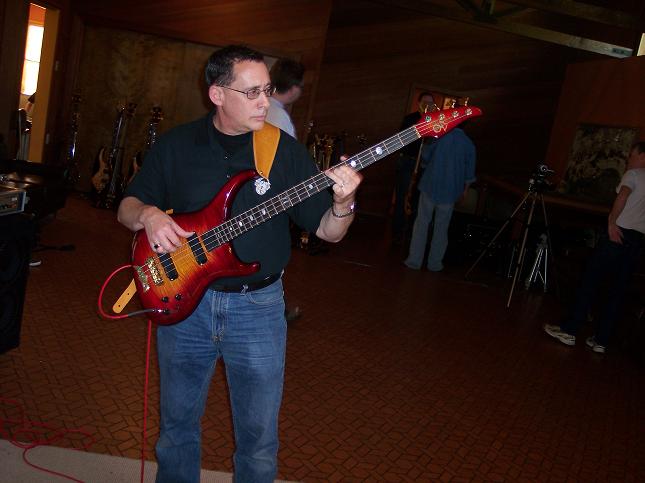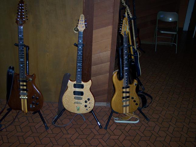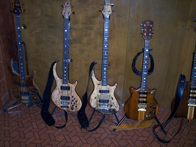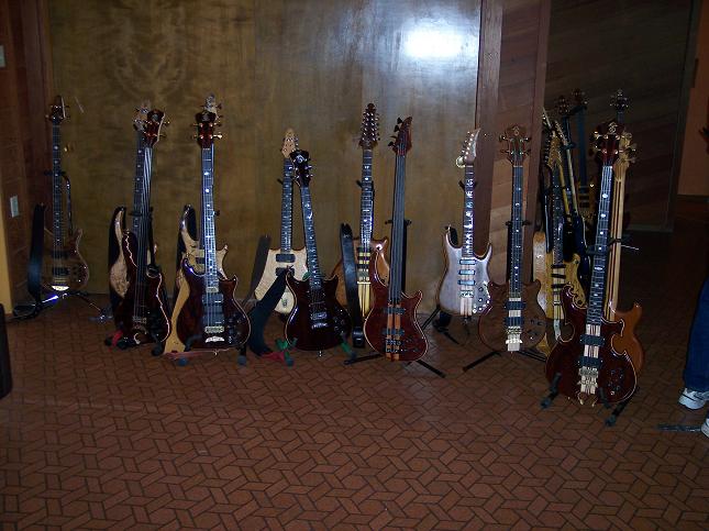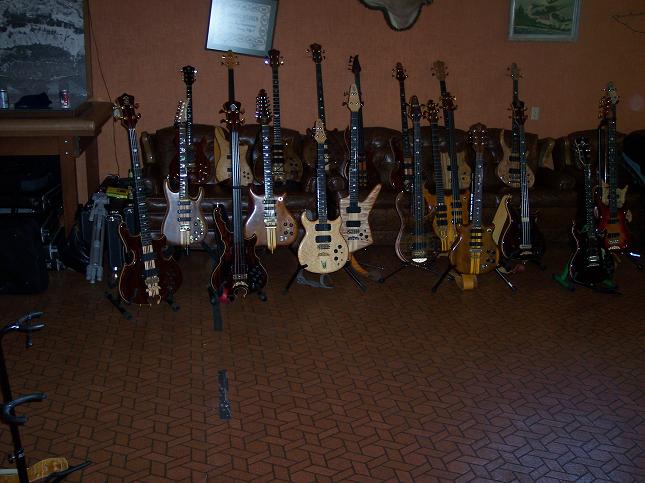 20 beautiful basses! Val's bird of prey was the first i noticed. that fretless did look amazing also. what a great room to jam in! just beautiful,everyone in cali. is so lucky. what a treat to have been there i'm sure. thx for the pics