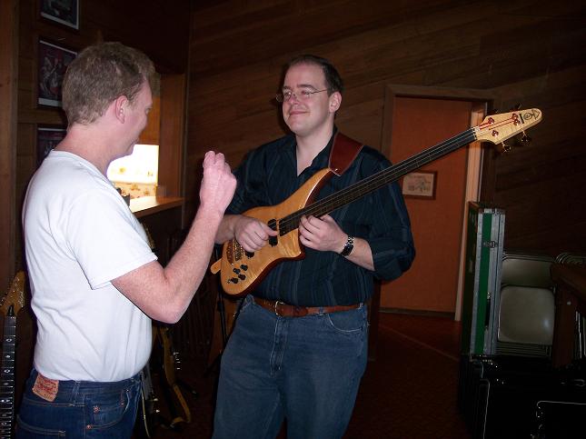 Seriously though, this was a blast.  It's a lot of fun to put faces to the names we all read around here.  The collection of instruments was nothing short of stunning.  A big thanks to everyone who came from not only Northern California, but as far away as Seattle!  A a very big thanks to Mica, Bill, and Ron who not only graced us with their friendly smiles and words, but even brought along goodies (cups and pins) for the attendees.  Jamming was great.  Improvising with 3 or 4 basses going was a unique and enjoyable experience.  Next time you guys should really work up Spinal Tap's Big Bottom!  LOL